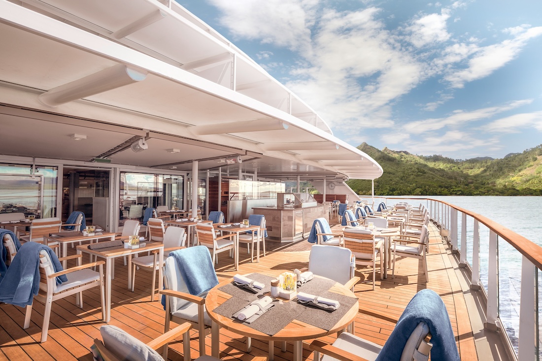 • Panoramaterrasse direkt am Meer, die sich über die gesamte Schiffsbreite erstreckt, mit einem großen privaten Whirlpool im Freien, Tagesbetten, einem Esstisch, einem Loungebereich, einer Dusche und Sonnenliegen